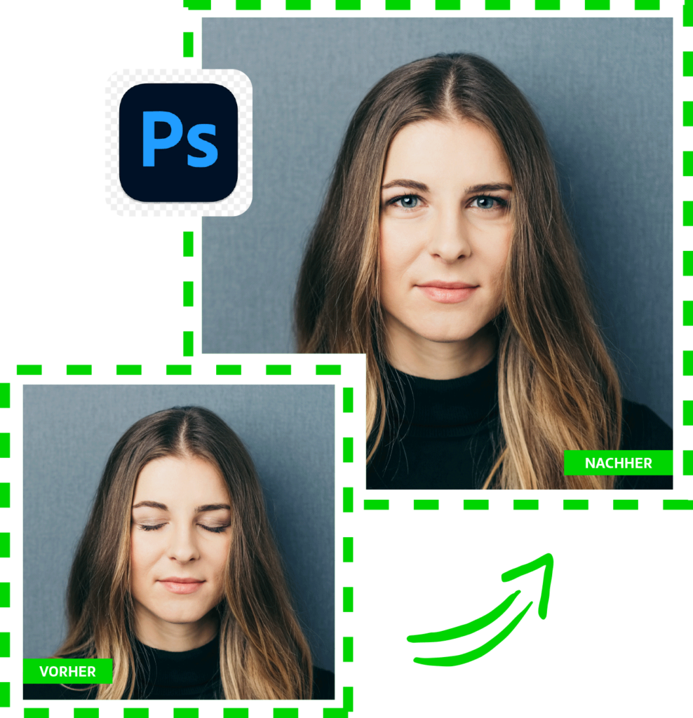 Manchmal sind auf dem besten Foto die Augen eines Motivs geschlossen – sei es durch einen unpassenden Moment oder ein unbeabsichtigtes Blinzeln. Unser Photoshop-Service ermöglicht es, geschlossene Augen digital zu öffnen und so den perfekten Ausdruck in Ihren Fotos zu erzielen.